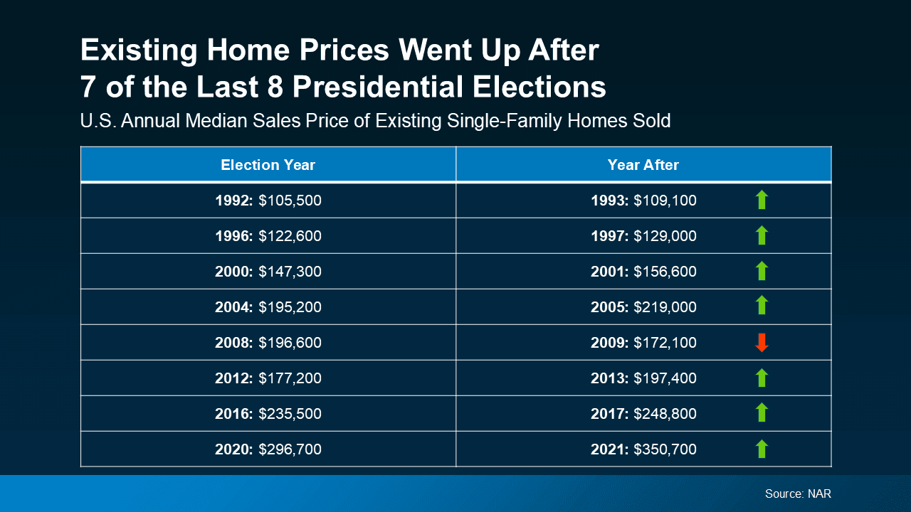 The latest data from NAR reveals that after 7 of the last 8 Presidential elections, home prices increased the following year (see chart below):